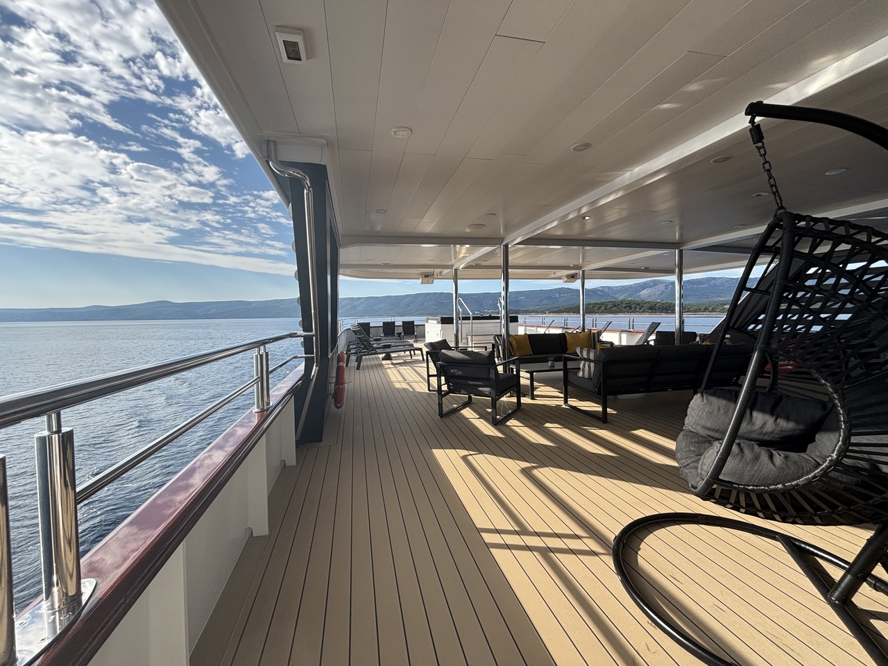 My Wish is a motor yacht for 36 guests. The main deck is given over to an airy dining room that opens on to a covered terrace with sofas and comfy chairs. Upstairs is another spot to sit and relax while up more stairs is the top deck with sun loungers… and a hot tub. There’s more deck space at the front. And at the back there’s a swimming platform with inflatable kayaks and paddleboards, snorkels and other water toys for the daily swimming stops. Rooms are divided between those with balconies and those semi-below deck with twin eye-level portholes. There are decent-sized shower rooms and TVs with Sky and BBC news. Décor, in room and around the ship, is Euro-chic, lots of black and many shades of grey laced with chrome.