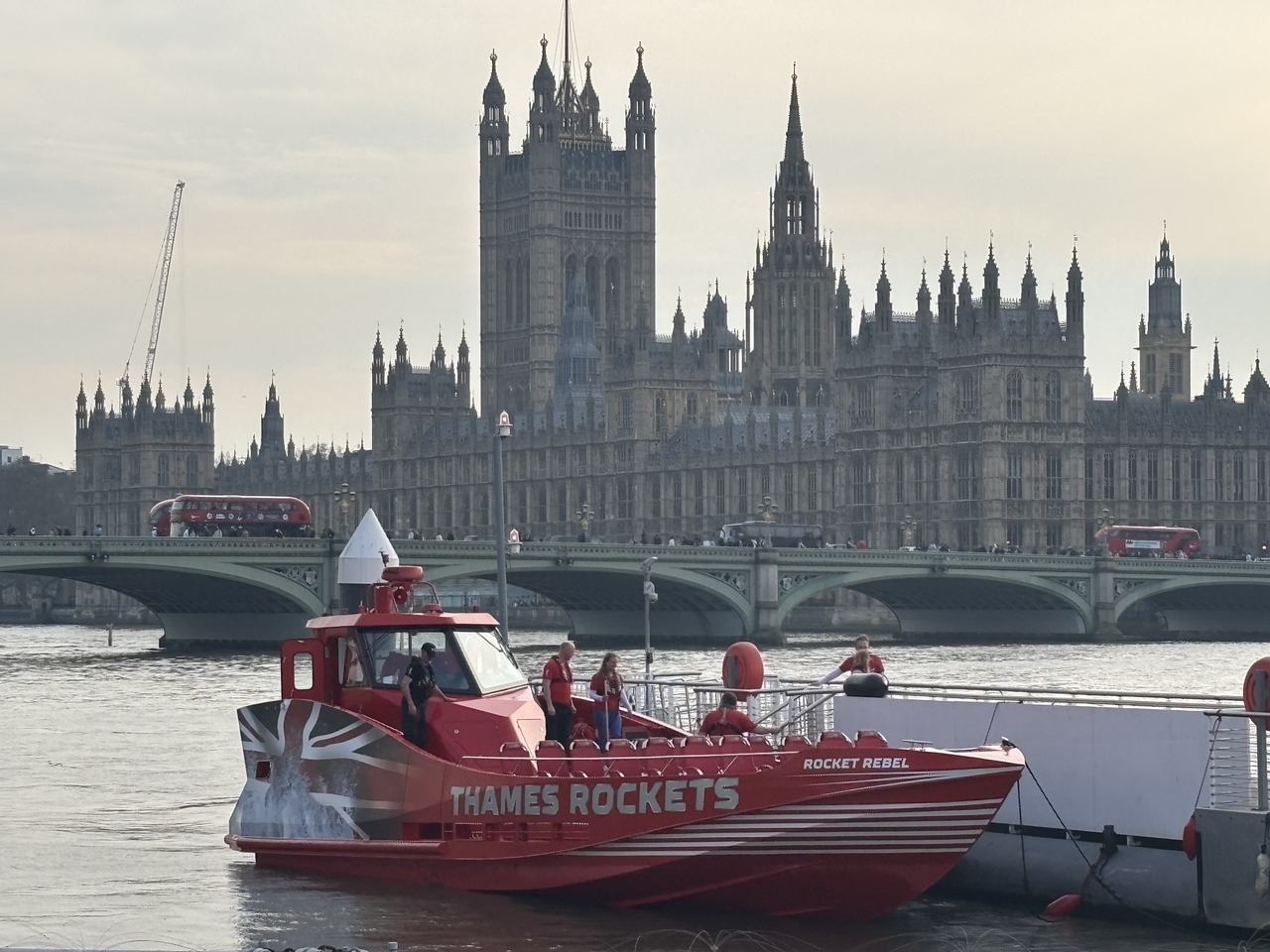 Breathtaking and hair-raising! Rocket Rebel sails from London Eye Pier in the heart of London. At first the Rocket Rebel Ultimate London Adventure is gentle as we head upriver a short way for a look at Big Ben and the Houses of Parliament, then we turn, and the adrenaline starts quietly pumping even though we’re still at a modest speed.